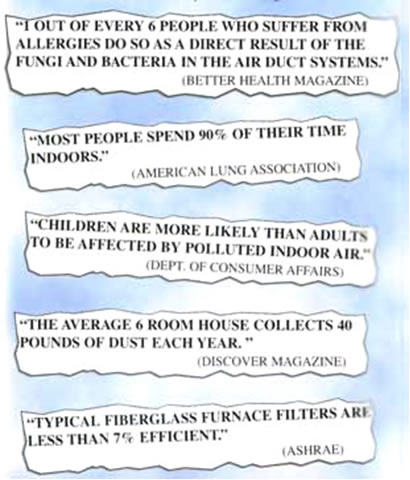 Smut, mildew, bacteria, dust mites, animal dander and other harmful pollutants build up in your duct work and heating system month after month, year after year. Filtered air ducts blow disease causing spores into your living environment every day.